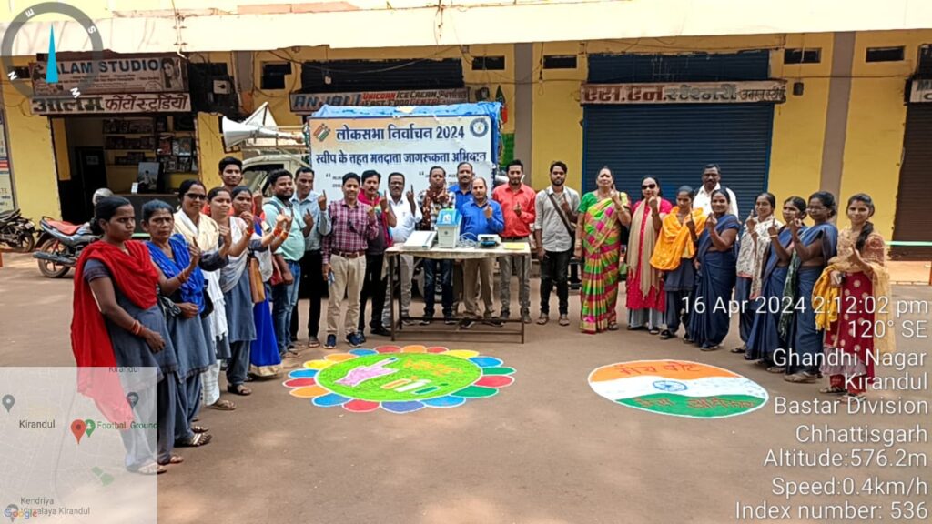 किरंदुल :- लोकसभा आम निर्वाचन 2024 के तहत मतदाताओं को जागरूक करने एवं नय मतदाताओं की जानकारी हेतु इव्हीएम मशीन की जानकारी एवं व्हीव्हीपेट का प्रदर्शन कर मतदाता जागरूकता एवं स्वीप कार्यक्रम का आयोजन फुटबॉल ग्राउंड किरंदुल के सामने आयोजित किया गया जिसमे रंगोली एवं अन्य माध्यम से प्रचार प्रसार किया गया आसपास क्षेत्रो एवं अन्य वार्डो मे शत प्रतिशत मतदान हेतु मतदाताओं को शपथ दिलाया गया जिसमे श्री महापात्र, एच एल बेलसेरे, टी आर सिन्हा,गौरीशंकर तिवारी, मनराखन ठाकुर, रामग़ुलाल साहू, पुहूप साहू, डेविड कुमार, संजय नायक , जॉर्डन राम, डी एस साहू, शांति मिडियामी,आंगनबाडी कार्यकर्त्ता आम नागरिक मौजूद रहें